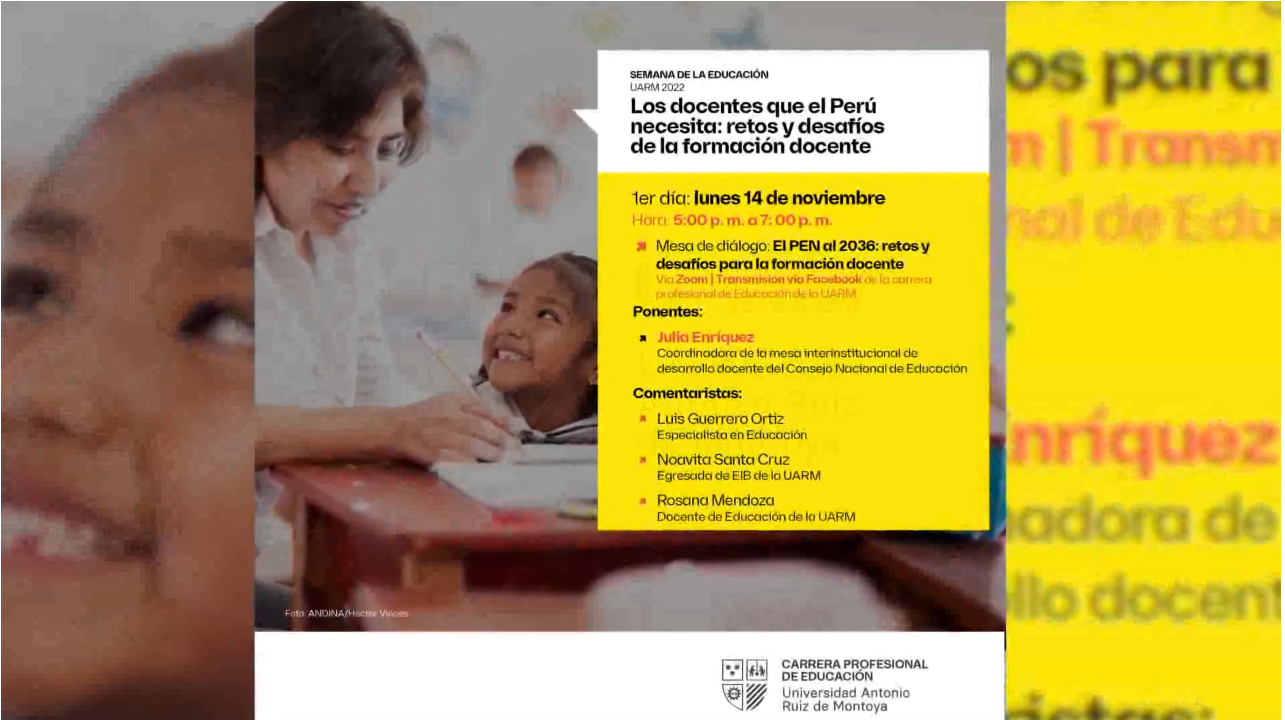 La carrera profesional de Educación de la Universidad Antonio Ruiz de Montoya, en el marco de la Semana de la Educación 2022, realizó la Mesa de diálogo: El PEN al 2036: retos y desafíos para la formación docente el 14 de noviembre. El evento contó con la participación de Julia Enríquez, coordinadora de la mesa interinstitucional de desarrollo docente del Consejo Nacional de Educación; Luis Guerrero Ortiz especialista en educación, Noavita Santa Cruz egresada de EIB de la UARM y Rosana Mendoza docente de educación de la UARM.