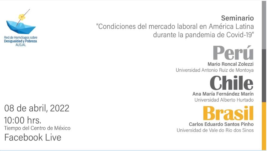 La Red de Homólogos Ausjal sobre Desigualdad y Pobreza – AUSJAL presentó el Seminario "Condiciones del mercado laboral en América Latina durante la pandemia de COVID-19″, el 8 de abril de 2022. En el evento participaron Mario Roncal Zolezzi, jefe de la carrera de Administración de la Universidad Antonio Ruiz de Montoya; Ana María Fernández Marín de la Universidad Alberto Hurtado de Chile; y Carlos Eduardo Santos Pinho de la Universidad de Vale do Rio dos Sinos de Brasil.