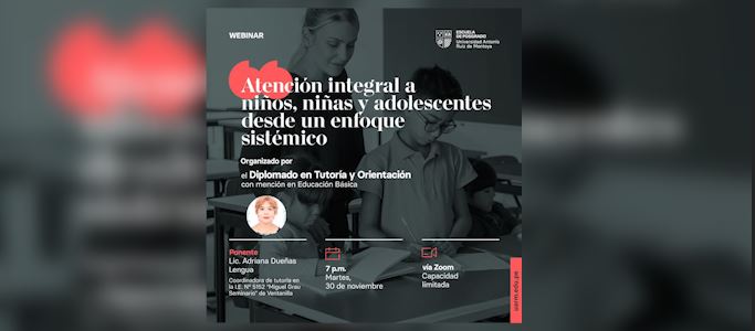La Escuela de Posgrado de la Universidad Antonio Ruiz de Montoya, a través del Diplomado en Tutoría y Orientación con mención en Educación Básica, realizó el Webinar: Atención integral a niños, niñas y adolescentes desde un enfoque sistémico, el 30 de noviembre. El evento tuvo como ponente a la Lic. Adriana Dueñas.