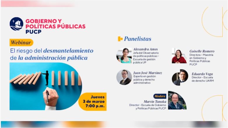 Eduardo Vega, director de la carrera de Derechode la Universidad Antonio Ruiz de Montoya, participó del webinar: "El riesgo del desmantelamiento de la administración pública", realizado el 3 de marzo por la PUCP.