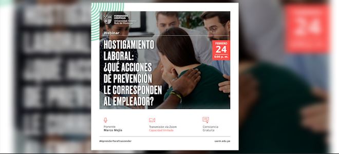 El área de Formación Continua de la Universidad Antonio Ruiz de Montoya, realizó el webinar: Hostigamiento Laboral ¿qué acciones de prevención le corresponden al empleador?, el 24 de febrero de 2022.