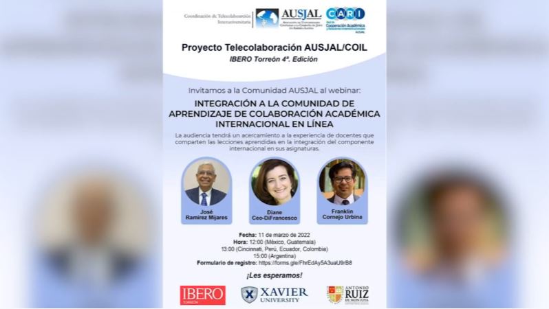 La Universidad Antonio Ruiz de Montoya participó en el webinar "Integración a la comunidad de aprendizaje de colaboración académica internacional" organizado por AUSJAL el 11 de marzo. En el evento participaron José Ramírez Mijares, docente de la Universidad Iberoamericana Torreón en México; Diane Ceo-DiFrancesco, docente de Xavier Univerity en Estados Unidos; y Franklin Cornejo Urbina, docente de la UARM.