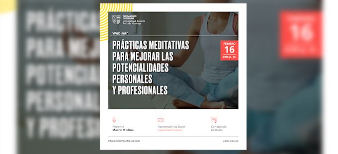 El área de Formación Continua de la Universidad Antonio Ruiz de Montoya (UARM), realizó el webinar: Prácticas meditativas para mejorar las potencialidades personales y profesionales, el 16 de febrero de 2022. La ponencia estuvo a cargo de Marco Medina , docente del curso de extensión Desarrollo del potencial humano y meditación