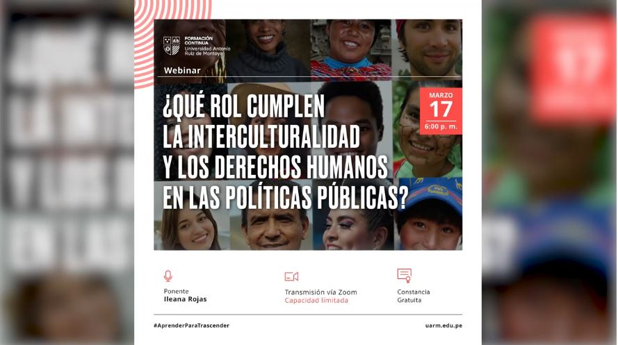 El área de Formación Continua de la Universidad Antonio Ruiz de Montoya presentó el Webinar: ¿Qué rol cumplen la interculturalidad y los derechos humanos en las políticas públicas? , el 17 de marzo de 2022. La ponencia estuvo a cargo de Ileana Rojas.