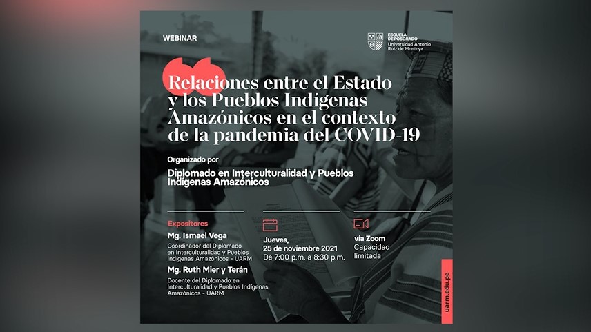 La Escuela de Posgrado de la Universidad Antonio Ruiz de Montoya (UARM) organizó el Webinar: Relaciones entre el Estado y los Pueblos Indígenas Amazónicos en la pandemia del COVID-19. Contó con la participación de Ismael Vega, coordinador del Diplomado en Interculturalidad y Pueblos Amazónicos, y con Ruth Mier y Terán, docente del mismo.