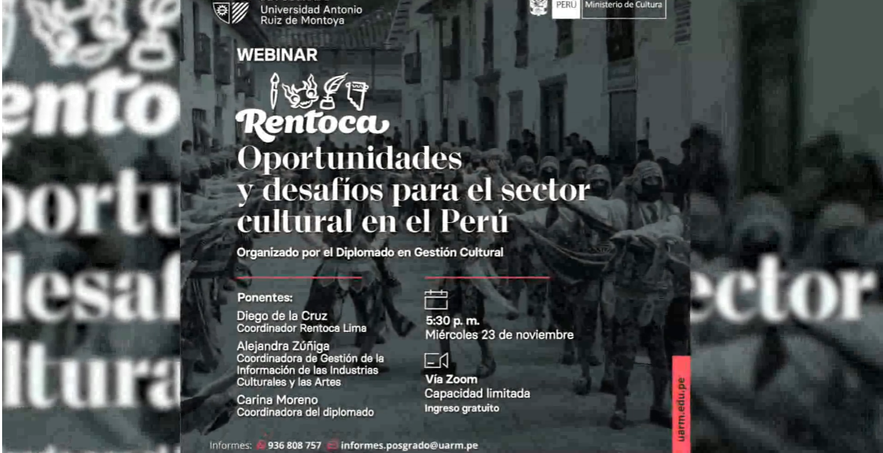 La Escuela de Posgrado de la Universidad Antonio Ruiz de Montoya realizó el webinar "RENTOCA- Oportunidades y desafíos para el sector cultural en el Perú", organizado por el Diplomado en Gestión Cultural, el 23 de noviembre. El evento contó con la participación de Alejandra Zúñiga, coordinadora de gestión de la información de las industrias culturales y las artes; Diego de La Cruz, coordinador del RENTOCA para la región Lima (Ministerio de Cultura) y Carina Moreno, coordinadora del Diplomado.