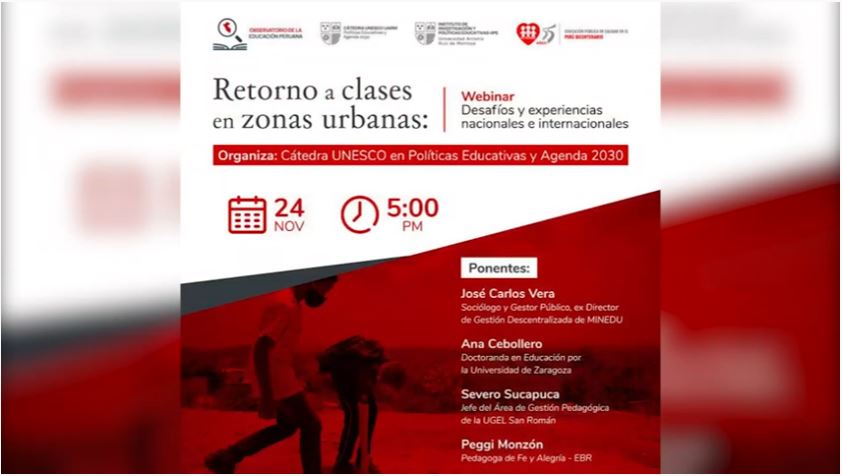 El Observatorio de la Educación Peruana presentó el webinar “Retorno a clases en zonas urbanas, desafíos y experiencias nacionales e internacionales”, realizado el 24 de noviembre. En el evento participaron José Carlos Vera, sociólogo y gestor público, ex director de Gestión Descentralizada de MINEDU; Ana Cebollero, doctoranda en Educación por la Universidad de Zaragoza; Severo Sucapuca, jefe del Área de Gestión Pedagógica de la UGEL San Román; y Peggi Monzón, Pedagoga de Fe y Alegría – EBR.