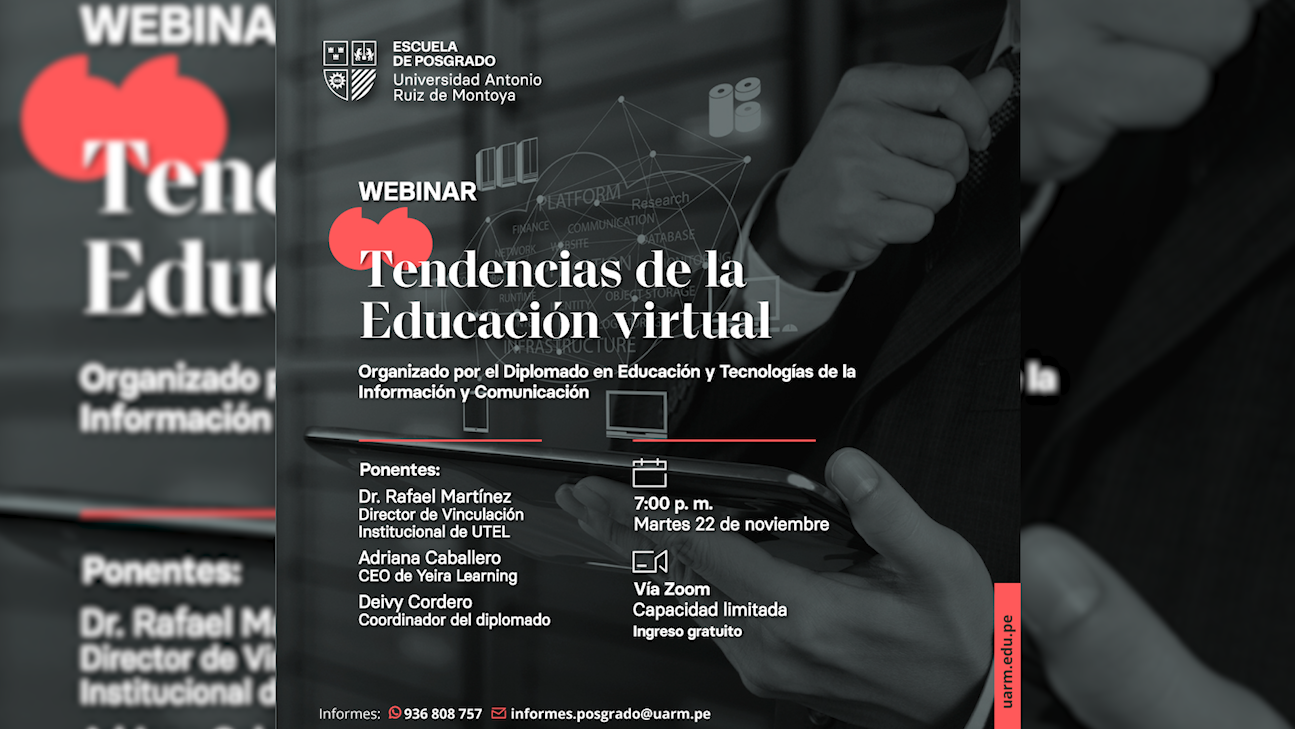 El Diplomado en Educación y Tecnologías de la Información y Comunicación (TIC) de la Escuela de Posgrado de la UARM, realizó el webinar "Tendencias de la Educación Virtual" el 22 de noviembre. El evento contó con la ponencia de Rafael Martínez, director de Vinculación Institucional de UTEL; Adriana Caballero, CEO de Yeira Learning; y Deivy Cordero, coordinador del Diplomado.