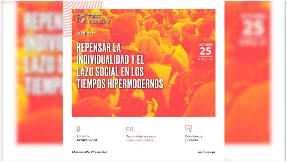 El área de Formación Continua  de la Universidad Antonio Ruiz de Montoya presentó el webinar “Repensar la individualidad y el lazo social en los tiempos hipermodernos”, realizado el 25 de octubre. En el evento participó como ponente Arturo Sulca.